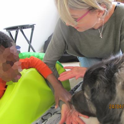 Mes interventions ont pour but, grâce à la présence du chien et aux échanges qu'il va permettre, d'aider l'enfant en difficulté à développer ses capacités physiques, psychiques, sociales et affectives. Le cadre relationnel simplifié que le chien propose est d'une richesse inestimable...